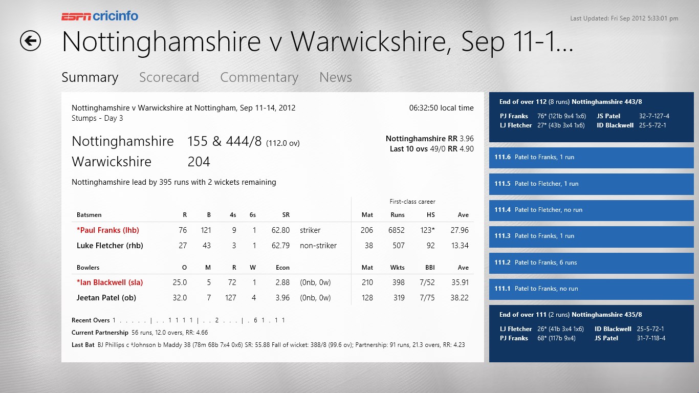 In addition to alerting you about a new story via auto notifications, it also shows the current scores in a tooltip when you hover over the espn cricinfo icon. Espncricinfo extension for google chrome, giving you the latest cricket news, features and live scores from the world's leading and favourite cricket site, espncricinfo.com. Read ball by ball commentary, series schedule of all icc international & domestic. Espncricinfo.com probably the best cricket site globally.it is wiki for cricket.best for analysis and new about cricket.it is owned popular sports channel espn cricbuzz.com its a completely indigenous site started by indian.it is the only site which can match espncricinfo in terms of popularity in india.if you want faster score updates this the. Specsavers county championship, friday, september 23, 2016 mar 30, 2017 news from the grounds, supporter views and our unrivalled live county scores service.